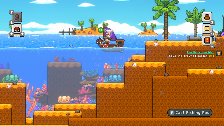 In the land of Azerim is the small town of Honeywood. For many adventures it is the gateway to grand adventures that will take you to undiscovered locations, however, something has gone wrong. Something has gone seriously wrong. Perhaps it was an evil spell, or gods playing with mortals, but all of the players have suddenly disappeared. Only the NPCs (Non-Player Characters) remain. An evil darkness is unleashed and it looks like all is doomed for Azerim, but wait, what is this? The local fisherman Baelin, a man who just wants a “Nice Day for Fishing”, is acting differently, something has happened to him, perhaps there is some outside force that wants to right the wrongs and has put all its trust on Baelin’s shoulders. Well, no matter what, that’s what we’ll go with. You see, you’re going to play this side-scrolling RPG as Baelin. All your skills will be needed as you learn to master his fishing rods. You will be asked by villagers to retrieve certain fish and certain artifacts that have become lost in three different bodies of water. You’ll be granted special skills that will allow you to do battle with the fish and hopefully live long enough to reel them all the way in.